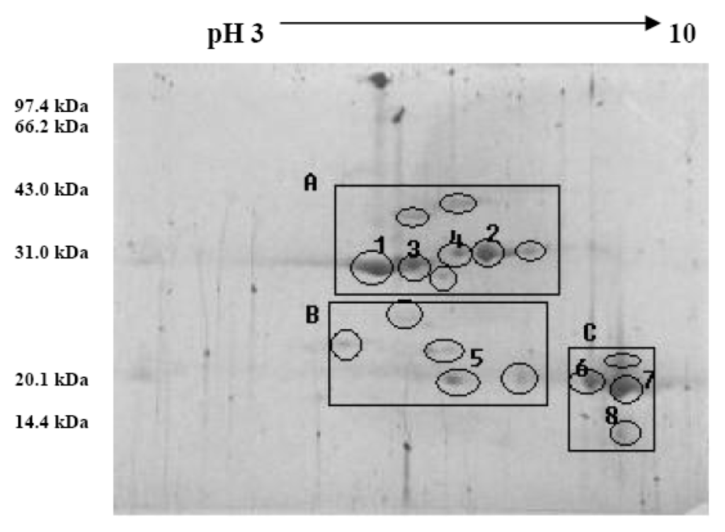 - Candiano, G.; Bruschi, M.; Musante, L.; Santucci, L.; Ghiggeri, G.M.; Carnemolla, B.; Orecchia, P.; Zardi, L.; Righetti, P.G. Blue silver: A very sensitive colloidal Coomassie G–250 staining for proteome analysis. Electrophoresis 2004, 25, 1327–1333. [Google Scholar]