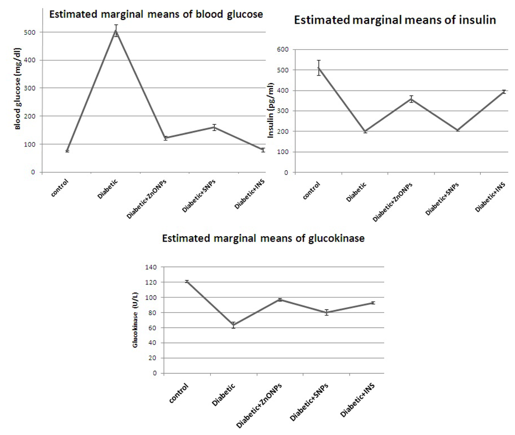 | Parameters | Control | Diabetic | Diabetic + ZnONPs | Diabetic + SNP | Diabetic + insulin |