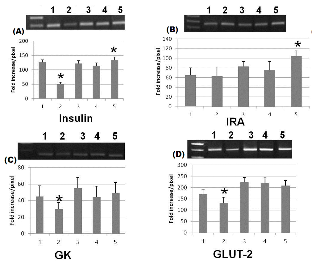 | Glucokinase (U/L) | 121 ± 1.51 a | 63.6 ± 3.83 d | 97 ± 1.58 b | 80.2 ± 3.86 c | 92.8 ± 1.48 b |