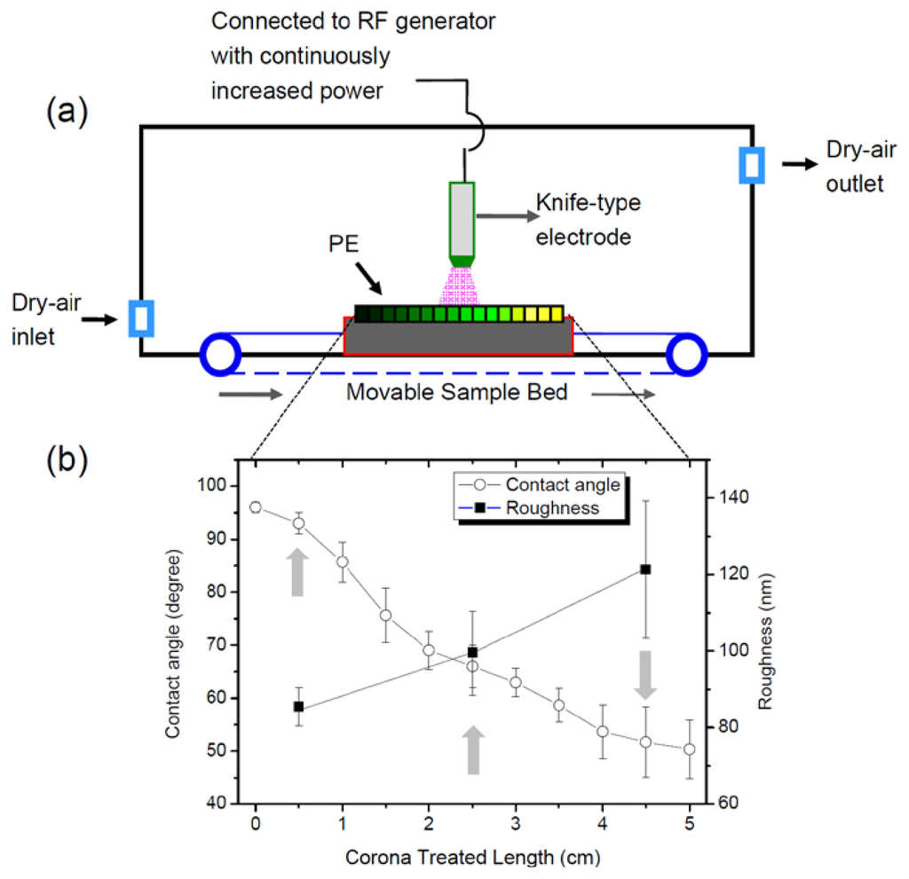 Thus, we and other researchers have focused on developing wettability gradient surfaces [10,14–18]. A gradient surface is a surface on which a continuously varying chemical or physical property exists along its length. If biologic molecules are introduced to a gradient surface, they display various behaviors throughout a single experiment. Thus, gradient surfaces have the advantage of reducing the number of experimental errors that might occur with separate experiments [10,14–18]. Our group used a homemade corona discharge to design wettability and rough gradient surfaces as shown in Figure 1a [14–21]. The power of the radio frequency corona discharge apparatus with knife-type electrodes was increased gradually using an automatic motorization drive. This apparatus can easily be used under atmospheric conditions and provides a gradient surface for oxygen-containing functional groups.