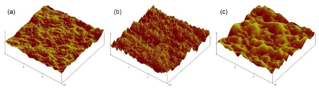 Atomic force microscopy (AFM) images of (a) L-0.5 (93º); (b) L-2.5 (65º) and (c) L-4.5 (52º).
