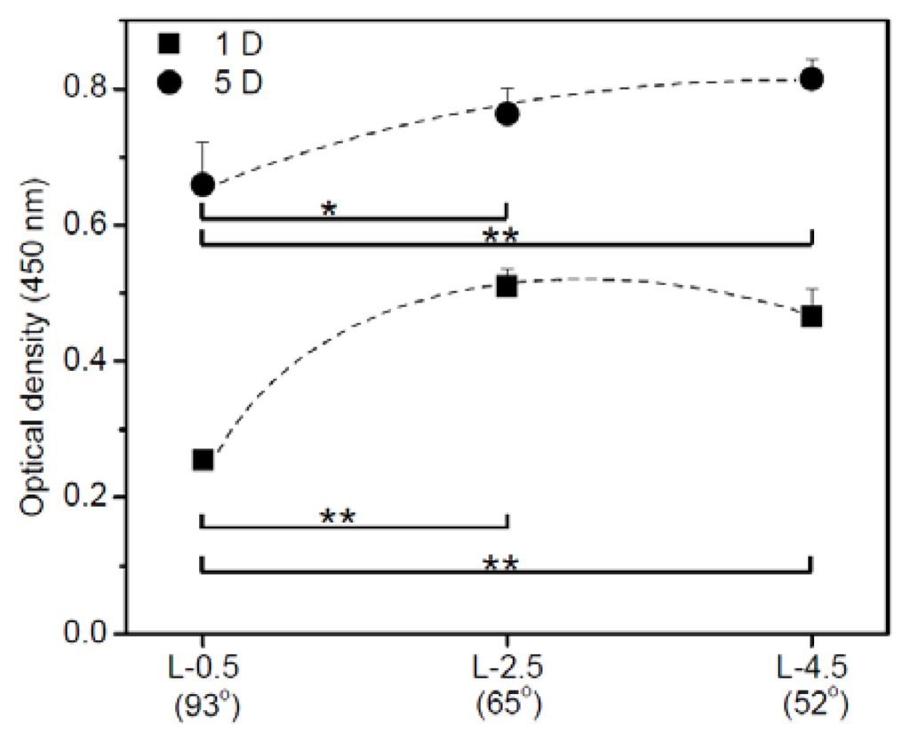 Figure 3 shows the cell proliferation on gradient surfaces. On day 1, hADSCs attached in greater numbers at L-2.5 than at L-0.5 and in slightly greater numbers than that at L-4.5 (hydrophobic and hydrophilic surfaces, respectively). The plot of attachment at 1 D versus water contact angle was parabolic. hADSCs at L-2.5 and L-4.5 showed nearly identical proliferation in culturing between days 1 and 5. The highest number of cells adhered when the water contact angle was below 65º. Lower cell adhesion occurred on surfaces with contact angles of 90º.