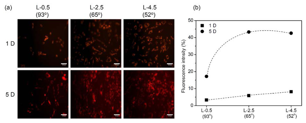 Figure 4 shows PKH red-labeled hADSCs and their fluorescence intensities on gradient PE surfaces. The red fluorescence expression indicated that the hADSCs attached and proliferated on gradient PE surfaces. The fluorescence intensity showed that the expression on the gradient surfaces at L-2.5 and L-4.5 was higher than that at L-0.5 and increased as culturing time increased. The number of hADSCs adhering to the gradient PE surface apparently increased gradually as the water contact angle decreased and the roughness increased.