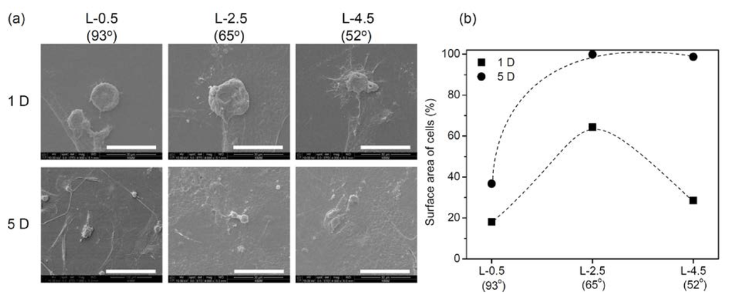 Figure 5 shows scanning electron microscopy images and surface areas of the hADSCs adhered to gradient PE surfaces on days 1 and 5. Most of the cells attached to L-0.5 and L-4.5 PE surfaces on day 1 had smaller surface contact areas, resulting in more rounded cell morphology. On day 5, the contact area of hADSCs was still small at L-0.5. However, hADSCs attached at L-2.5 and L-4.5 had higher surface areas, resulting in a more flattened morphology.
