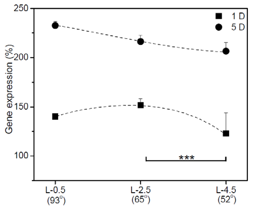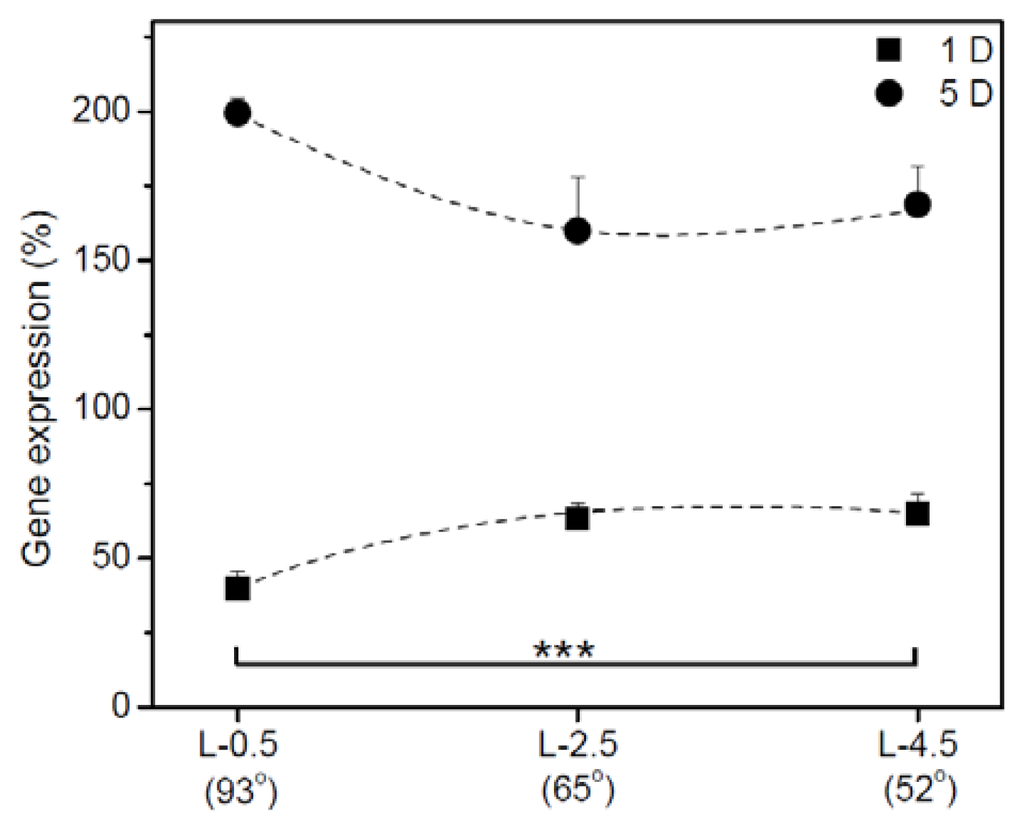 The IGb expression of hADSCs adhering to gradient surfaces was further examined. Figure 6 shows the relative expression of IGb mRNA in hADSCs adhering to gradient PE surfaces after 1 and 5 D of culture. On day 1, the expression of IGb on the surface at L-2.5 was slightly higher than those at L-0.5 and L-4.5. On day 5, IGb gene expression on the surface at L-2.5 and L-4.5 was increased. Meanwhile, IGb expression was dramatically increased in hADSCs on the surface at L-0.5.