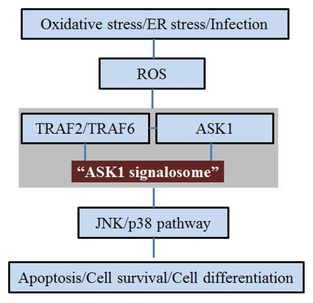 Schematic representation of the relationship between apoptosis signal regulating kinase 1 (ASK1) and c-Jun N-terminal kinases (JNK)/p38 pathway activated by various stresses. Various stresses including oxidative stress, ER stress, and bacterial infection, generate reactive oxygen species (ROS). ASK1 activates by forming ASK1 signalosome with TNF receptor-associated factor (TRAF)2/TRAF6. The ASK1 signalosome induces the JNK/p38 pathway and regulates a variety of cellular signal pathways including cell death, cell survival, and the cell differentiation pathway.