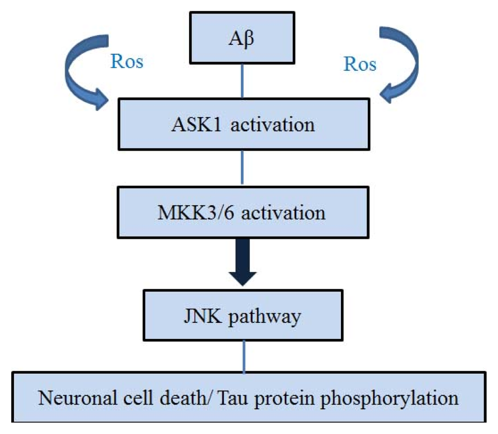 Schematic representation of the relationship between ASK1 and Aβ. Aβ activates ASK1 and MKK3/6 by ROS. Aβ induces the JNK signal pathway, which induces neuronal cell death and phosphorylation of tau protein. Finally, activation of ASK1 by Aβ is associated with neuronal cell death and phosphorylation of tau protein.
