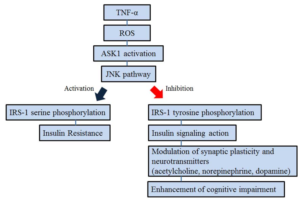 Schematic representation of the relationship between ASK1 and insulin signal transduction. TNF-α triggers the activation of ASK1 mediated JNK signaling. The activation of TNF-α-induced JNK signaling induces serine phosphorylation of insulin receptor substrate (IRS)-1 and insulin resistance whereas the inhibition of TNF-α-induced JNK signaling induces tyrosine phosphorylation of IRS-1 and enhancement of cognitive decline. Finally, ASK1 is related to insulin signal transduction through TNF-α-induced JNK signaling. The inhibition of ASK1 enhances the cognitive decline in AD.