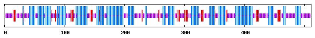 Predicted secondary structure of Tianfu goat PPP3CA amino acid (AA) sequence. The blue line represents α-helix, the red line represents extended strand, and the purple line represents random coil.