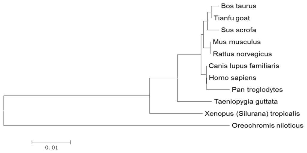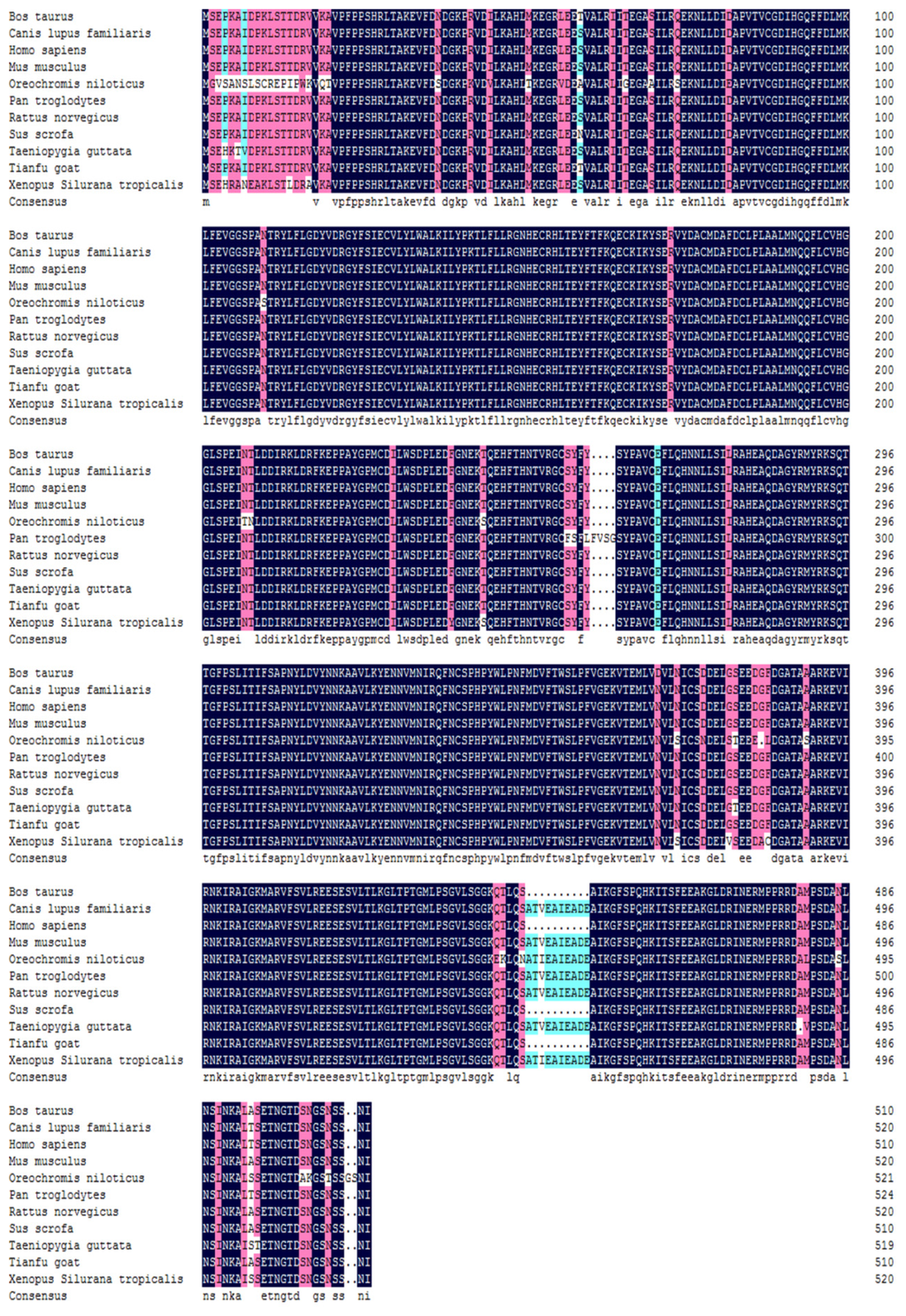 Sequence alignment using DNAMAN V6 software revealed that the coding nucleotide sequence of the Tianfu goat PPP3CA gene was 97.1% identical to bovine PPP3CA, and 96.7%, 93.9%, 91.2%, 90.6%, 95.6%, 92.7%, 86.8%, 83.2% and 76.2% identical to porcine, dog, mice, rat, human, chimpanzee, finch, frog and tilapia, respectively, and the amino acid sequences were 99.8%, 99.6%, 97.7%, 97.7%, 97.7%, 99.6%, 96.0%, 96.2%, 95.0% and 87.2% identical to bovine, porcine, dog, mice, rat, human, chimpanzee, finch, frog and tilapia, respectively (Figure 2). Sequence alignment revealed that PPP3CA proteins from different species were highly conservative.