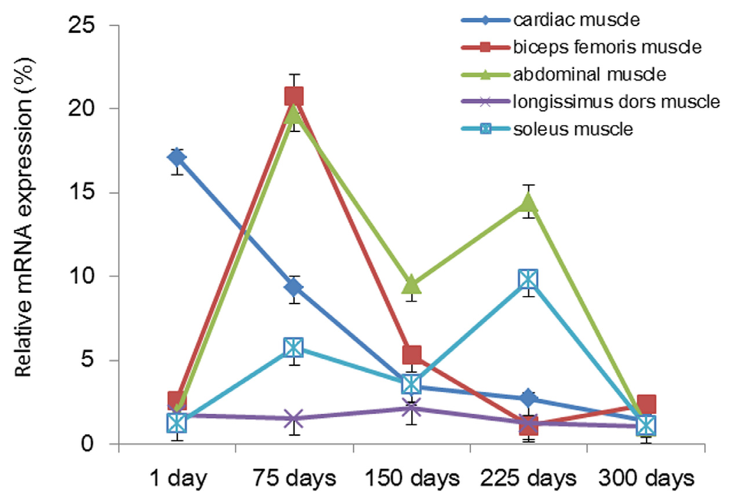 All experimental procedures were approved by Sichuan Agricultural University Animal Care and Use Committee, Sichuan Agricultural University, Sichuan, China under permit No. DKY-B20100805. All of the Tianfu goats were bred under the same standard conditions and slaughtered on the 1st, 75th, 150th, 225th, and 300th day after birth (n = 8 per group). The five muscle samples, including cardiac muscle, biceps femoris muscle, abdominal muscle, longissimus dors muscle and soleus muscle, were harvested, frozen in liquid nitrogen, and stored at −80 °C until total RNA and protein extraction.