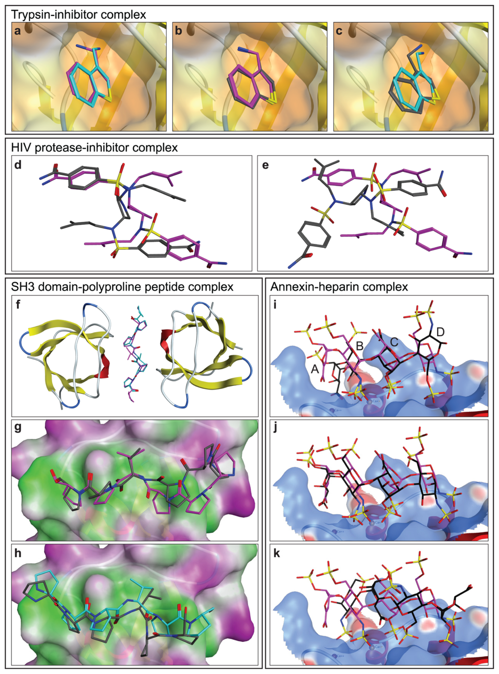 Complexes exhibiting multipose binding. (a,b,c) Trypsin-inhibitor complex. The protein receptor is depicted as a cartoon and an orange molecular surface. Crystal ligands in orientations I and II are shown in magenta and blue sticks, respectively. AutoDock docking solutions are shown in grey sticks; (d,e) HIV protease-inhibitor complex. The crystallographic ligand in orthorhombic orientation is shown in magenta sticks, and the AutoDock solutions analogous to orthorhombic (d) and to hexagonal (e) orientations are shown in grey sticks for comparison; (f,g,h) SH3 domain-polyproline peptide complex. The SH3 domain is depicted as a cartoon, and the crystal ligands in orientation I and II are shown in magenta and blue sticks, respectively. The crystal unit cell is shown in (f). In (g) and (h) a molecular surface is colored by lipophilicity (green: lipophilic, pink: hydrophilic), and the MOE docking solutions are shown in grey sticks (orientation I: (g), orientation II: (h)); and (i,j,k) Annexin A2-heparin complex. The protein is shown as a cartoon, and a molecular surface indicates the electrostatic potential (blue: positive, red: negative). The crystal ligand is shown in magenta sticks, and AutoDock docking solutions in black (poses I, II and III are shown in panels (i), (j) and (k), respectively). The sugar rings in the ligand are labeled for clarity (A, B, C and D).