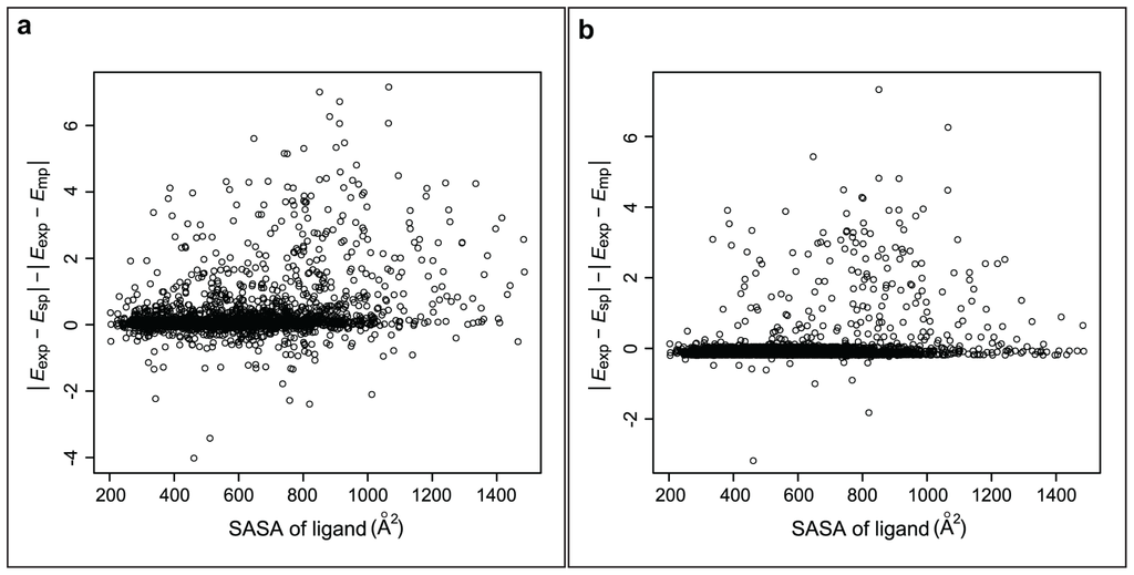 The difference of absolute single-pose and multipose residuals |Eexp − Esp| − |Eexp − Emp| is plotted against the solvent accessible surface area of the ligand. All values above zero denote an improvement of the binding affinity prediction. (a) Two-pose case considering the top score and the best pose from the Refined-eHiTS combination; and (b) Multipose case considering all poses from the Refined-eHiTS combination.