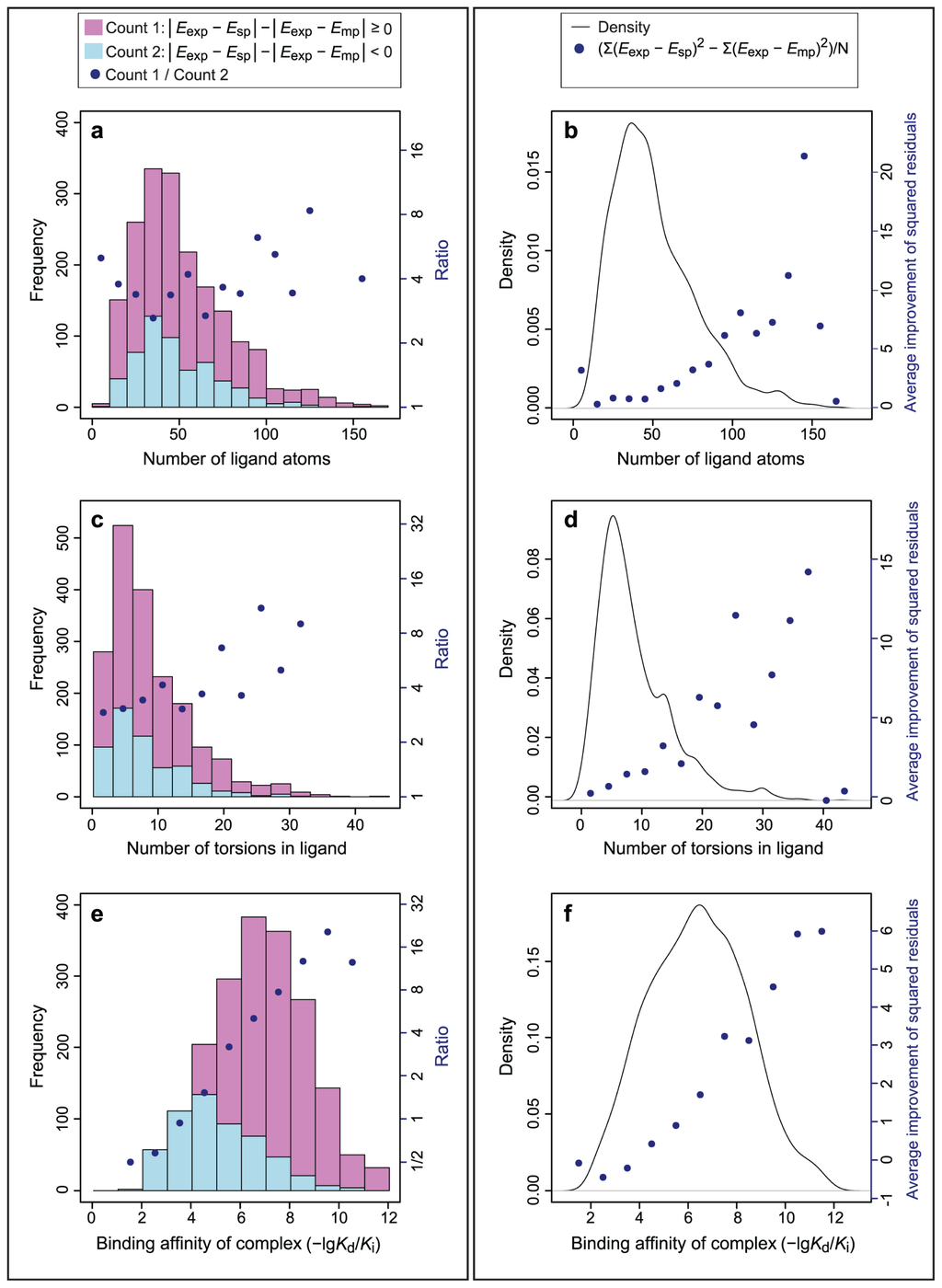 Analysis of the number of ligand atoms (a,b); ligand flexibility (c,d); and experimental binding affinity (e,f); in relation to the effect of multipose binding on binding affinity prediction for the two-pose case considering the top score and the best pose from the Refined-eHiTS combination. (a,c,e) Ratio of “improved” (pink) and “not-improved” (light blue) binding affinities; and (b,d,f) Average improvement of the squared residuals shown in dots and density of the ligand property shown as a line.