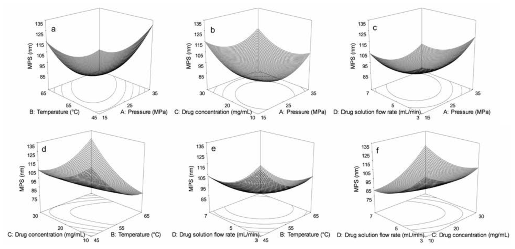 Response surfaces were drawn to evaluate the effects of parameters and their interactions on MPS of GTW. The optimal values of the selected variables were obtained by solving the regression equation using the “Design Expert” software version 7.0. There were a total of 29 runs for optimizing the four individual parameters in the current Box–Behnken design (BBD), which was applied to the production of GTW nanoparticles. The values of responses (MPS of GTWs) at different experimental combination for coded variables were given in Table 1, from which we can see that the MPS ranged from 78.9 to 131.8 nm. The 3D response surfaces were graphical representations of the regression equation. Each contour curve represented an infinitive number of combinations of two test variables, keeping the other factors fixed at the zero level. Figure 1a shows that the 3D response surface of precipitation pressure (X1) and precipitation temperature (X2) with fixed drug concentration and drug solution flow rate (0 level). The MPS of GTW decreased as the precipitation pressure or precipitation temperature increased, and increased with further increases in the precipitation pressure or precipitation temperature. The 3D response surface for interaction of precipitation pressure (X1) and drug concentration (X3) with fixed precipitation temperature and drug solution flow rate (0 level) was shown in Figure 1b. We can see that the MPS of GTW decreased dramatically with the precipitation pressure increasing and remained constant with further increases in the precipitation pressure. The MPS of GTW decreased as the drug concentration increased and increased slowly as the drug concentration increased more. Figure 1c presents the 3D response surface of precipitation pressure (X1) and drug solution flow rate (X4) with fixed drug concentration and precipitation temperature (0 level), from which we can see that the MPS of GTW decreased and then increased slightly as the precipitation pressure or drug solution flow rate increased. Figure 1d shows that the 3D response surface of precipitation temperature (X2) and drug concentration (X3) with fixed precipitation pressure and drug solution flow rate (0 level). The MPS of GTW decreased significantly as the precipitation temperature increased. The MPS of GTW decreased and then remained constant with the drug solution flow rate increasing. The response surface for interaction of precipitation temperature (X2) and drug solution flow rate (X4) with fixed precipitation pressure and drug concentration (0 level) was shown in Figure 1e. We can see that the MPS of GTW decreased and then remained constant as the precipitation temperature and drug solution flow rate increased. Fig 1f presents the 3D response surface of drug concentration (X3) and drug solution flow rate (X4) with fixed precipitation pressure and precipitation temperature (0 level), from which we can see that the MPS of GTW decreased significantly as the drug solution flow rate increased. The MPS of GTW decreased and then remained constant as the drug concentration increased.