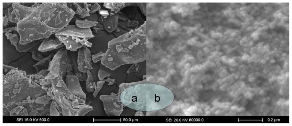 SEM images of unprocessed GTW (a), processed GTW was obtained under the optimum extraction condition: 29.4 MPa precipitation pressure, 63.5 °C precipitation temperature, 10.2 mg/mL drug concentration, 5.4 mL/min drug solution flow rate (b).