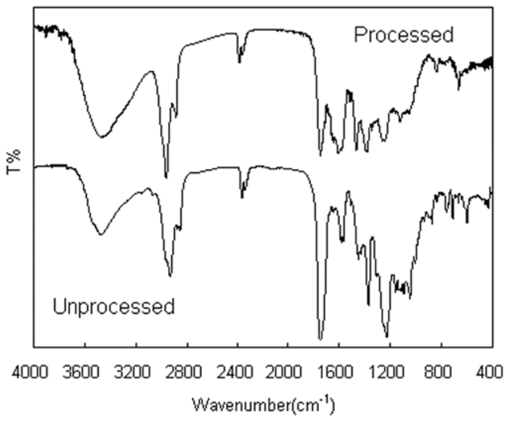 Comparative investigations on FTIR spectra of unprocessed and processed GTW.