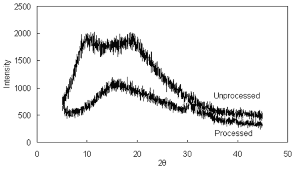 X-ray diffraction patterns were obtained in transmission using an X-ray diffractometer with a rotating anode (Philips, Xpert-Pro, Almelo, The Netherlands) with Ni-filtered Cu Kα1 radiation generated at a voltage of 40 kV and 30 mA. Powders of the unprocessed and processed GTW were filled to the same depth inside the sample holder by leveling with a spatula. The range of 2θ diffraction angle examined was 5°–45° with steps of 0.02° and a measuring time of 0.3 s per step.