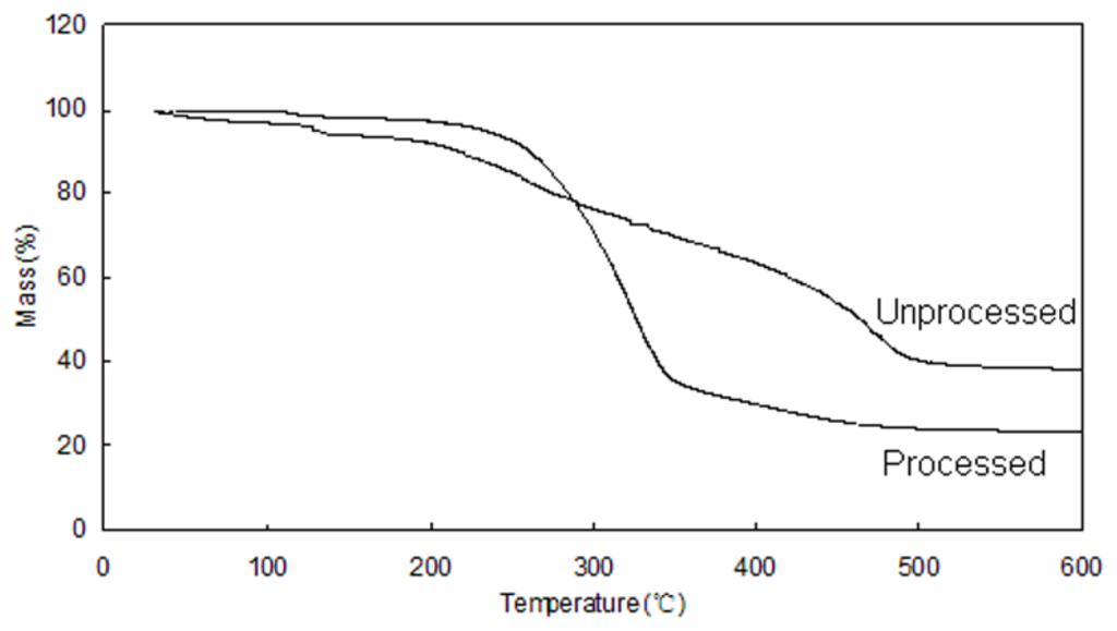 The thermal gravimetric analysis of samples was carried out with a Perkin-Elmer Pyris 1 TG instrument (Perkin-Elmer Co., Norwalk, CT, USA). The experiments were performed with a heating rate of 10 °C/min using nitrogen flow (150 mL/min) and unprocessed and processed GTW powers were weighed (approximately 5 mg) in open aluminum pans and the percentage weight loss of the samples were monitored from 35 to 600 °C.