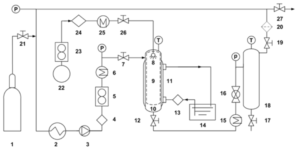 Schematic diagram of the experimental apparatus for the SAS process. 1, CO2 cylinder; 2, CO2 cooler; 3, CO2 pump; 4 and 24, liquid pump; 5 and 23, flowmeter; 6, 15 and 25, heat exchangers; 7, 12, 17, 19, 21, 26 and 27, valves; 8, nozzle; 9, stainless steel core vessel of 150 μm; 10, precipitation chamber; 11, jacket bath; 13, hot water circulating pump; 14, thermal bath; 16, back pressure valve; 18, gas-liquid separation chamber; 20, filter; 22, liquid solution supply.