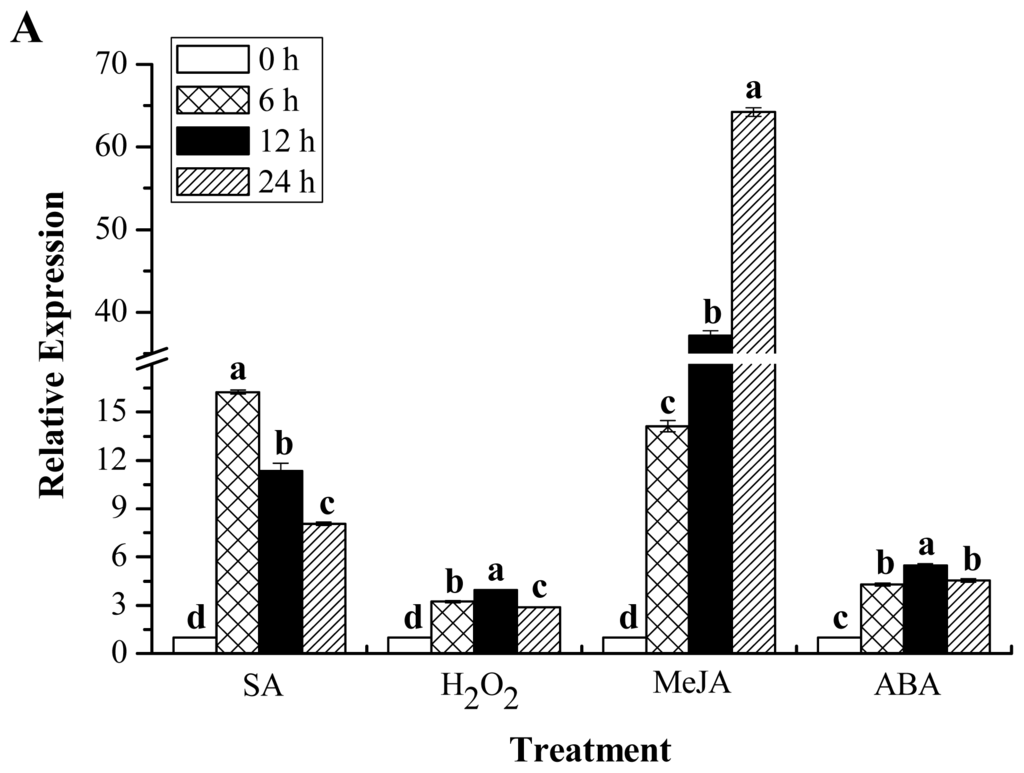 Furthermore, Yacheng05–179 plantlets under the stresses of 5 mM SA, 10 mM H2O2 (hydrogen peroxide), 25 μM MeJA, 100 μM ABA, 250 mM NaCl, 100 μM CuCl2, 25% PEG (polyethylene glycol) and 4 °C low temperature were carried out to examine the expression profiles of ScChi response to these stresses. As shown in Figure 10, the ScChi transcript was strongly induced by all of these exogenous stresses, including different plant hormones, oxidative stress, hyper-osmotic stress, metal stress, as well as temperature stress. It is interesting that under all the above abiotic treatments, ScChi showed a positive response in the early time of the stresses and maintained an increased transcript from 0 to 12 h or even to 24 h in the same cases of MeJA, NaCl and CuCl2 stresses.
