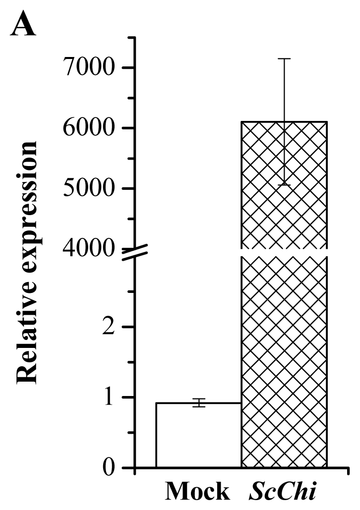RT-qPCR was carried out with the SYBR Green Master (ROX) kit (Roche, Shanghai, China) on a 7500 RT-qPCR system (Applied Biosystems, Foster, CA, USA). The primer sequences for ScChi (ScChi-QF/ScChi-QR) and GAPDH (GAPDH-QF/GAPDH-QR) [53] were shown in Table 1. The RT-qPCR was performed in a final volume of 20 μL, which contained 0.5 μM of each primer, 10 μL FastStart Universal SYBR Green PCR Master (ROX) (Roche, Shanghai, China) and 2.0 μL template (10× diluted cDNA). PCR with distilled water as the template was performed as the blank control. The RT-qPCR cycling conditions were as follows: 50 °C for 2 min, 95 °C for 10 min, 40 cycles of 95 °C for 15 s and 60 °C for 1 min; and the melting curve was established at the end of the amplification. Each RT-qPCR was conducted in triplicate. The 2−Δ ΔCt method was used to calculate the relative gene expression [54].