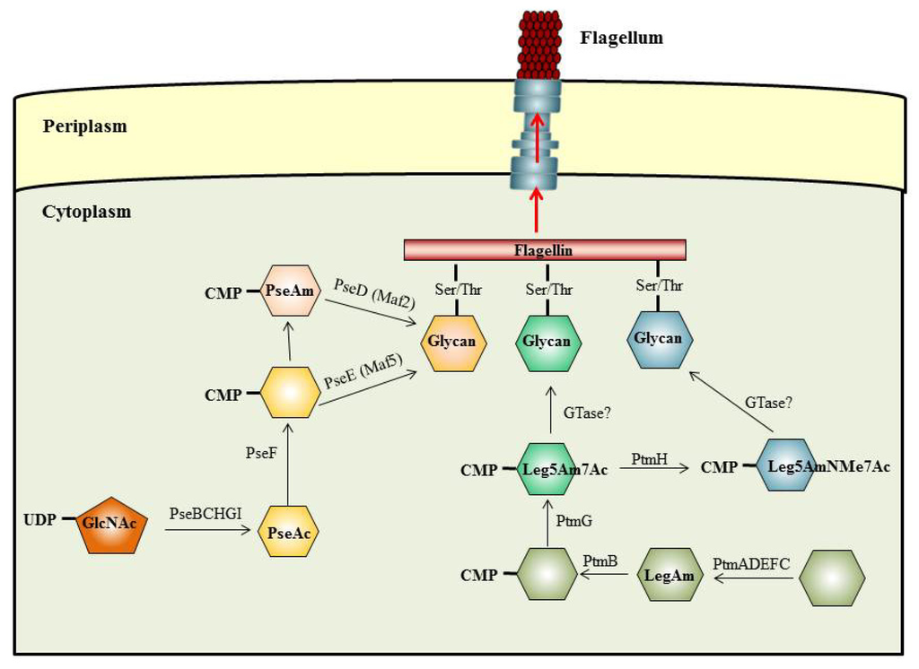 To date, only a few flagellin glycosylation pathways have been elucidated, including the Pse pathway of H. pylori and C. jejuni [49], the Leg pathway of C. jejuni [75], the Wbp pathway of P. aeruginosa [56], and the Vio pathway of P. syringae [76]. Furthermore, the complete pathway of bacterial flagellin glycosylation is still not clarified although some data suggest that flagellin O-glycosylation takes place at the cytoplasm-inner membrane interface in the close vicinity of the basal body by sequential transfer of nucleotide-activated sugar to the serine or threonine residues in the flagellin subunits, as the Figure 1 shows [4,19]. This would permit the assembly of complexes required for the process of glycosylation, in particular for the type of complex glycans composed of multiple monosaccharides. Data supporting that glycosylation occurs in the close vicinity of the basal body and prior to export of flagellin have been found in C. jejuni 81–176, since some enzymatic components of the O-linked flagellin glycosylation machinery have been localized at the pole of the cell along with the flagella. Furthermore, flagellins of C. jejuni 81–176 with a mass that is consistent with full glycosylation could be detected in mutants blocked at early and middle levels of the flagellar hierarchy, as well as in absence of a functional export apparatus [77]. These data, considered together with the transit of unfolded flagellin monomers through the filament channel to the tip, suggest that glycosylation should occur at some point when the unfolded flagellin monomers will be exported by the export apparatus. Furthermore, the modified flagellin monomers should be recognized by the export apparatus prior to export.