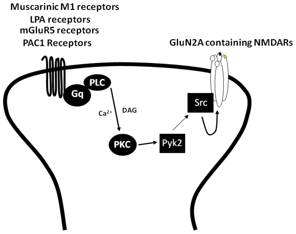 The activation of Gαq coupled receptors induces PLC/PKC/Pyk2/Src signalling to enhance GluN2A containing NMDAR function.