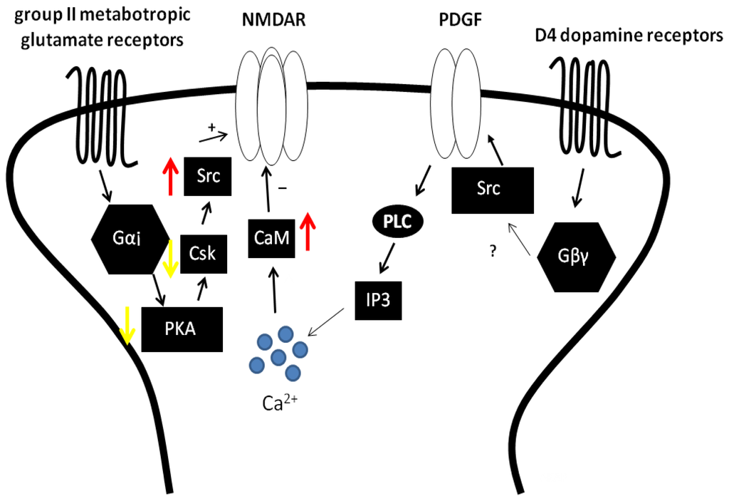 Gαi coupled receptors increase or decrease NMDAR function depending on the signalling pathways recruited. The activation of dopamine D4 receptor depresses NMDAR mediated currents by transactivating PDGF receptors. The resulting increased PLC activity hydrolyzes PIP2 leading to the generation of IP3 and DAG. The release of Ca2+ from internal stores following IP3 receptor stimulation activates CaM, which then promotes calcium dependent inactivation of NMDARs. In contrast, activation of group II mGluRs enhance NMDAR mediated currents via PKA/Csk/Src dependent pathway.