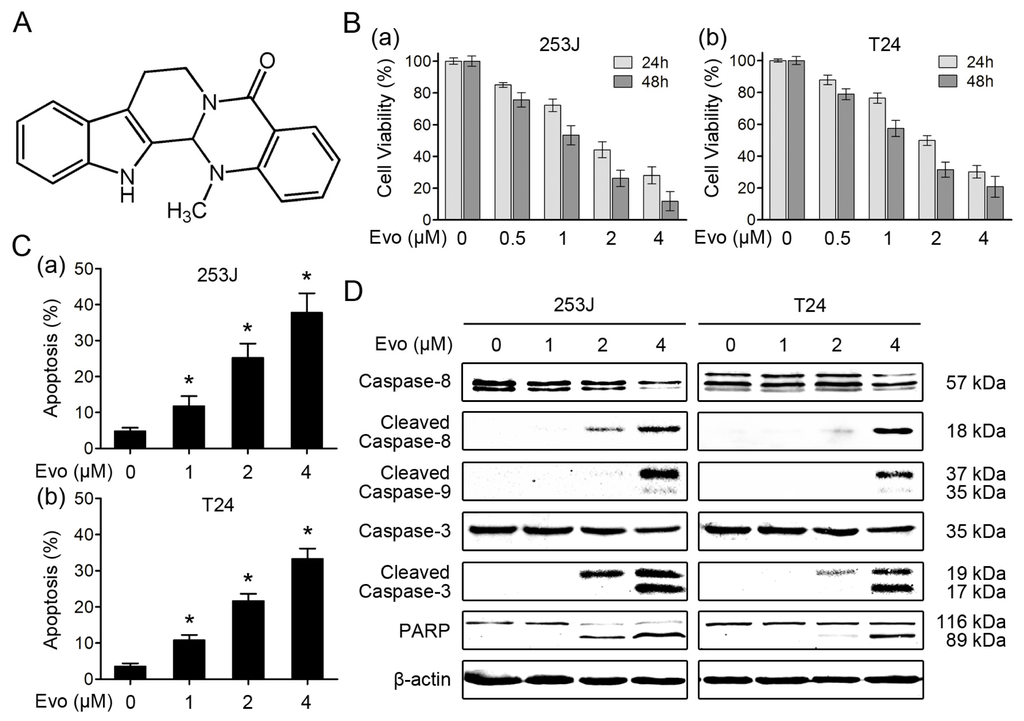 Evodiamine induces apoptosis in human bladder cancer cells. (A) Chemical structure of evodiamine (Evo); (B) Evodiamine inhibits the proliferation of bladder cancer cells. 253J (a) and T24 (b) cells were seeded in 96-well cell culture plates and treated the next day with evodiamine at the indicated concentrations for 24 and 48 h. Cell viability was assessed by MTT assay and expressed as percent of control. Columns, means of triplicate determinations; Bars, SDs; (C) Evodiamine induces apoptosis in bladder cancer cells. 253J (a) and T24 (b) cells were treated with evodiamine at the indicated concentrations for 24 h, and then harvested for detection of apoptosis by Annexin V staining. * p < 0.05 versus control; (D) Activation of caspases and PARP in apoptosis induced by evodiamine. After treatment as in panel C, cells were harvested for Western blotting to detect the cleavage of caspase-8, caspase-9, caspase-3 and PARP. β-actin was used as a loading control. Data shown are representative of three independent experiments.