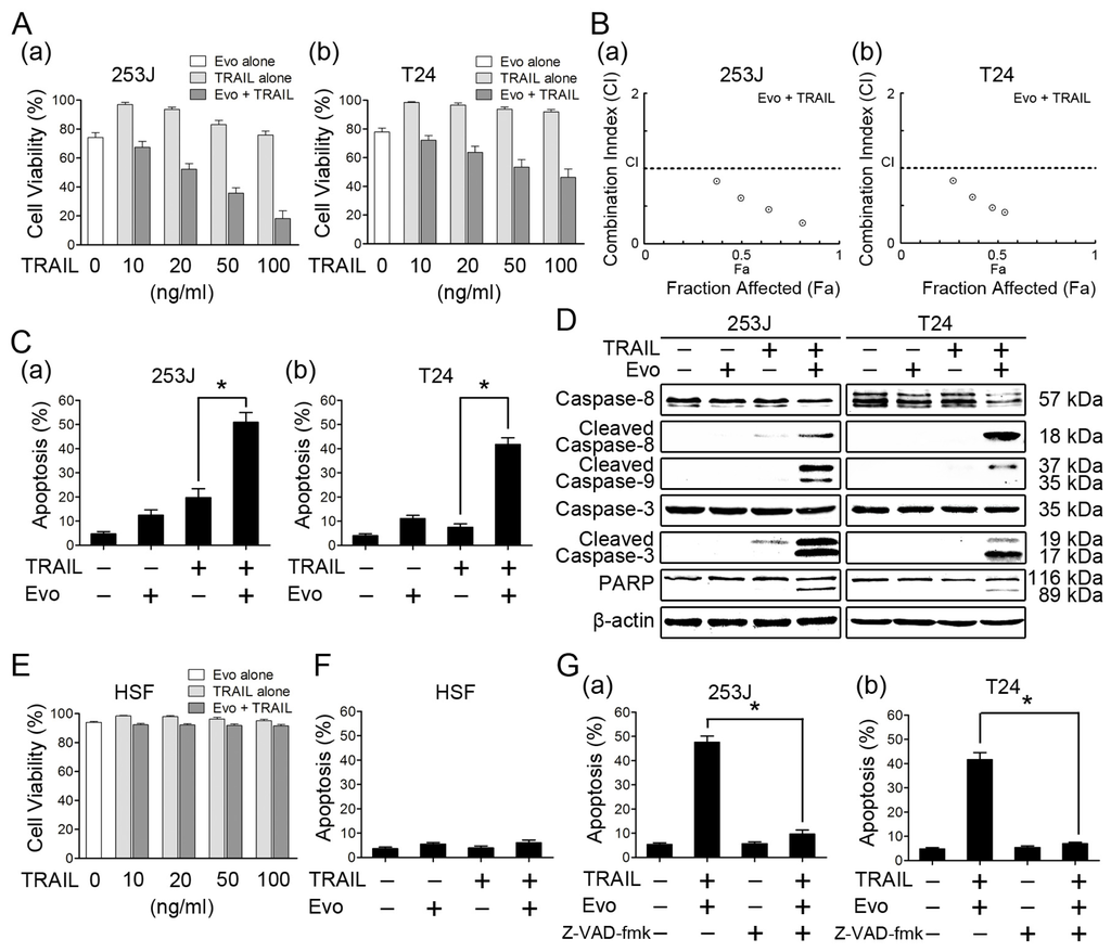 We next determined whether evodiamine could enhance TRAIL-induced apoptosis in bladder cancer cells. Evodiamine alone (1 μM), TRAIL alone (10, 20, 50, 100 ng/mL), and then the combination of evodiamine and TRAIL were applied to 253J and T24 cells. As shown in Figure 2A, 253J cells were partially resistant and T24 cells were highly refractory to TRAIL, which were consistent with previous studies [24,25]. Evodiamine at 1 μM decreased the cell viability of 253J and T24 cells by 25.80% and 22.10% respectively, but the combination of evodiamine and TRAIL exhibited much greater potency than either agent alone in decreasing the cell viability of these two bladder cancer cells. The combination indexes for these combinations were lower than 1 in both 253J and T24 cells (Figure 2B), indicating that the combination of evodiamine and TRAIL synergistically decreases the survival of bladder cancer cells. Consistently, the combination of evodiamine (1 μM) and TRAIL (100 ng/mL) was more effective than either agent alone in inducing apoptosis, evaluated by Annexin V assay (Figure 2C). Taking the 253J cell line as an example, there were approximately 12.42% and 19.71% of apoptotic cells in cells treated with evodiamine and TRAIL respectively, but 50.92% of apoptotic cells after exposure to the combination of evodiamine and TRAIL. In western blot analysis, the combination treatment was also more potent than either agent alone in inducing cleavage of caspase-8, caspase-9, caspase-3, and PARP, evidenced by either reduction of proforms or appearance of the cleaved bands (Figure 2D). These results collectively indicate that evodiamine enhances TRAIL-induced apoptosis in bladder cancer cells. In contrast, the combination treatment of evodiamine and TRAIL had no significant cytotoxic and pro-apoptotic effects on normal human skin fibroblast (HSF) cells (Figure 2E,F), suggesting that this combined treatment may be preferentially toxic to bladder cancer cells over normal fibroblast cells. We also examined the importance of caspases in evodiamine-mediated enhancement of TRAIL-induced apoptosis. Pretreatment with the pan caspase inhibitor z-VAD-fmk substantially prevented the apoptosis induced by the combined treatment (Figure 2G), indicating that the combination of evodiamine and TRAIL induces caspase-dependent apoptosis.