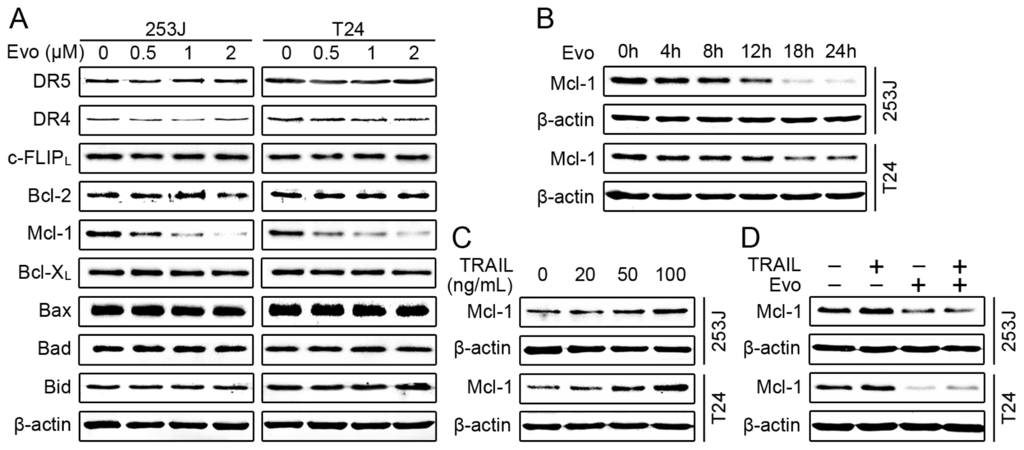 To reveal the mechanism by which evodiamine induces apoptosis and enhances TRAIL-induced apoptosis, we first examined the modulatory effects of evodiamine on DR4, DR5 and c-FLIP, which are the key components of extrinsic apoptotic pathway and often involved in drug-mediated enhancement of TRAIL-induced apoptosis [26]. Both 253J and T24 cells were treated with different concentrations of evodiamine for 24 h and harvested to detect these molecules. As shown in Figure 3A, evodiamine did not alter the levels of DR4, DR5, and c-FLIPL. Another well studied c-FLIP isoform, c-FLIPS, was hardly detectable in these two bladder cancer cell lines. We further investigated whether evodiamine affected the levels of the Bcl-2 family members (e.g., Bax, Bcl-2, Bcl-XL and Mcl-1), which have been implicated in the regulation of intrinsic apoptotic pathway and cancer cell response to TRAIL-induced apoptosis [11,27]. Data in Figure 3A revealed that evodiamine did not alter the levels of Bax, Bad and Bid. Bcl-2 levels were slightly decreased in 253 cells but not in T24 cells, whereas Bcl-XL levels were not reduced in both cell lines. On the other hand, the levels of Mcl-1 were significantly reduced by evodiamine in a dose-dependent manner in 253J and T24 cells. Time course analysis demonstrated that Mcl-1 reduction occurred at about 4 h and was sustained up to 24 h in both bladder cancer cells after evodiamine treatment (Figure 3B). These results indicate that downregulation of Mcl-1 may be critical for evodiamine to induce apoptosis and enhance TRAIL-induced apoptosis. Recent studies have reported that TRAIL could upregulate Mcl-1 protein levels, which is associated with TRAIL resistance [28,29]. We also observed that TRAIL increased Mcl-1 levels in a dose-dependent manner in 253J and T24 cells (Figure 3C). Moreover, Mcl-1 elevation induced by TRAIL was prevented in the presence of evodiamine (Figure 3D). Taken together, these results further support the notion that downregulation of Mcl-1 may be the underlying mechanism by which evodiamine induces apoptosis and enhances TRAIL-induced apoptosis. Therefore, we focused our further analyses on Mcl-1 in the following experiments.