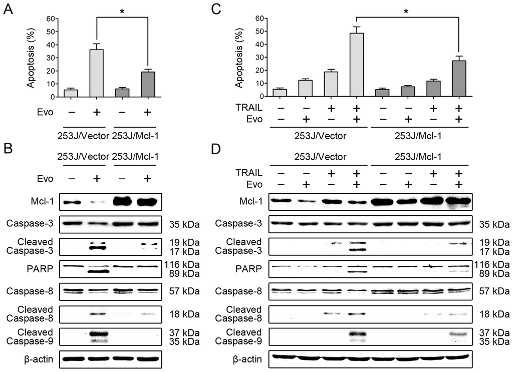 Overexpression of Mcl-1 attenuates the effects of evodiamine alone or in combination with TRAIL on induction of apoptosis. (A) Overexpression of Mcl-1 protects cells from evodiamine (Evo)-induced apoptosis. 253J/vector and 253J/Mcl-1 cells were treated with 4 μM evodiamine for 24 h and then harvested for detection of apoptosis by Annexin V staining. Columns, means of triplicate determinations; Bars, SDs. * p < 0.05; (B) Overexpression of Mcl-1 reduces evodiamine-induced cleavage of caspases and PARP. After treatment as in panel A, the cells were harvested for Western blotting to detect the cleavage of caspase-8, caspase-9, caspase-3 and PARP; (C) Overexpression of Mcl-1 protects cells from apoptosis induced by the evodiamine and TRAIL combination. Cells were treated with 1 μM evodiamine alone, 100 ng/mL TRAIL alone, and their combination for 24 h. The cells were then harvested for detection of apoptosis by Annexin V staining. Columns, means of triplicate determinations; Bars, SDs. * p < 0.05; (D) Overexpression of Mcl-1 reduces the cleavage of caspases and PARP induced by the evodiamine and TRAIL combination. After treatment as in panel C, the cells were harvested for Western blotting to detect the indicated proteins. β-actin was used as a loading control. Data shown are representative of three independent experiments.