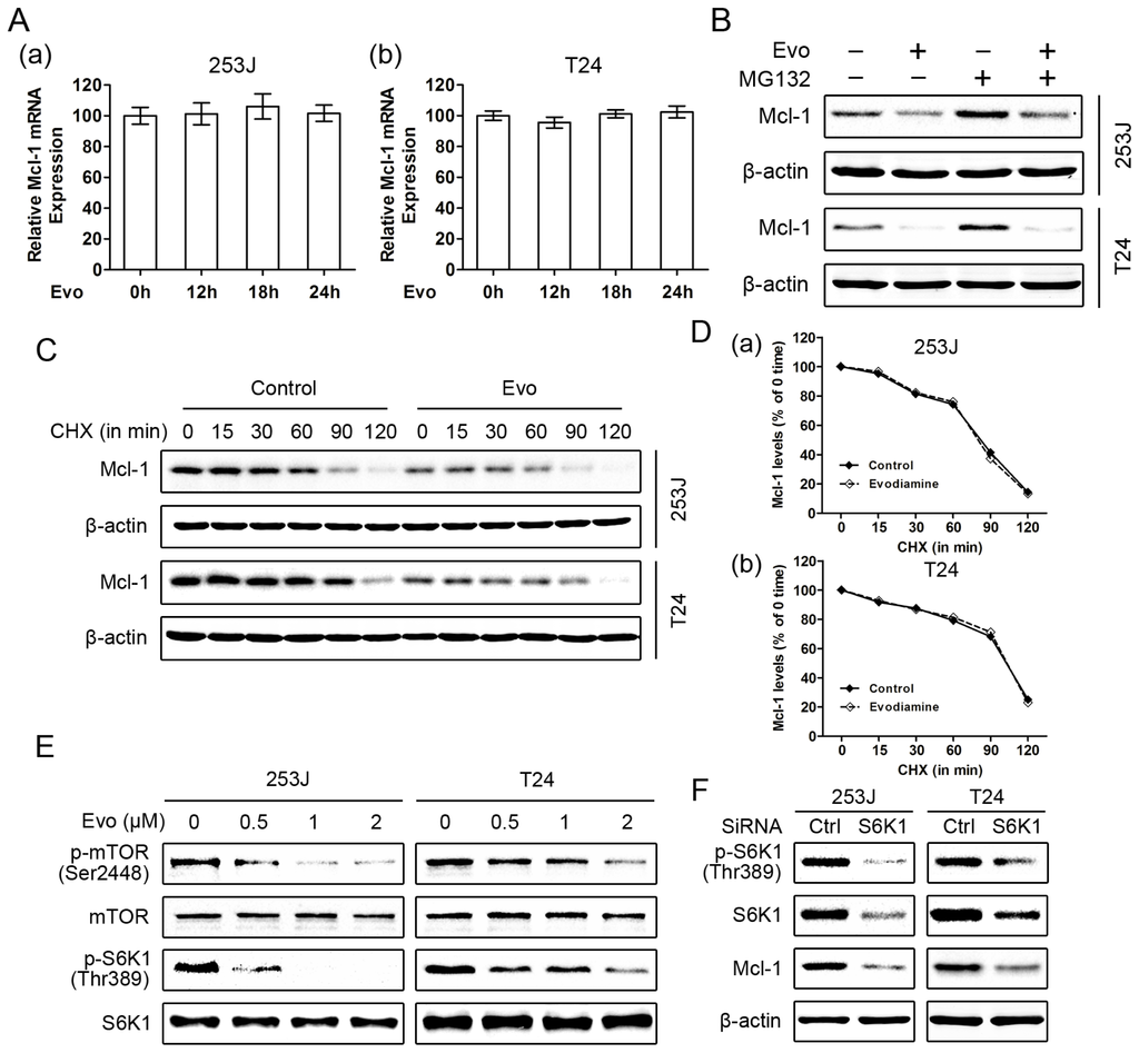 Evodiamine downregulates Mcl-1 expression through the mTOR/S6K1 pathway. (A) Evodiamine (Evo) does not affect Mcl-1 mRNA expression. 253J (a) and T24 (b) cells were treated with 1 μM evodiamine for the indicated times. The expression levels of Mcl-1 mRNA were analyzed by quantitative real-time PCR. Columns, means of triplicate determinations; Bars, SDs; (B) The proteasome inhibitor MG132 does not inhibit Mcl-1 reduction by evodiamine. The given cell lines were treated with 1 μM evodiamine for 24 h, and were either incubated or not with 20 μM MG132 for the last four hours. Cells were harvested to detect Mcl-1 protein levels; (C,D) Evodiamine does not alter the protein stability of Mcl-1. Cells were treated with or without 1 μM evodiamine for 12 h, followed by 10 μg/mL cycloheximide (CHX) for the indicated times. Mcl-1 protein levels were analyzed by Western blotting (C). Protein levels were then quantified with Quantity One software (Bio-Rad) and normalized to β-actin. The results were plotted as the relative Mcl-1 levels compared with those at the time 0 of CHX treatment (D); (E) Evodiamine suppresses the phosphorylation of mTOR and S6K1. 253J and RT4 cells were treated with 1 μM evodiamine for the indicated times and subsequent harvested to detect the phosphorylation of mTOR and S6K1; (F) Knockdown of S6K1 reduces Mcl-1 levels. Cells were transfected with control (Ctrl) or S6K1 siRNA. Forty-eight hours after transfection, the cells were harvested for Western blotting to detect the indicated proteins. β-actin was used as a loading control. Data shown are representative of three independent experiments.