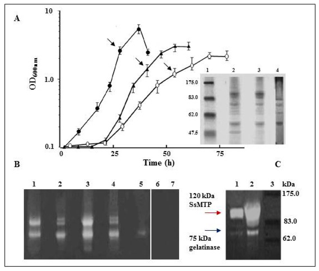 A more accurate analysis of the extracellular TYS-proteome by SDS-gelatin zymogram (Figure 1C) showed two main activity bands, the most abundant being a 120 kDa gelatinase, corresponding to the already characterized SsMTP and a 75 kDa gelatinase, whose relative intensity increased during cell growth until the stationary phase (data not shown). These findings provide physiological and biochemical evidence that protein degradation products in S. solfataricus occur mainly by means of extracellular acidic proteases.