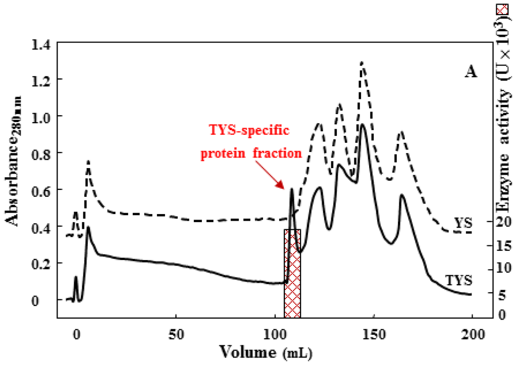 With the aim of identifying the protein associated with the 75 kDa gelatinase band, a purification strategy was assessed. In the setting up of a separation procedure, the choice of the first chromatographic step was critical to obtain the effective isolation of the acidic protease. Therefore, by way of a combination of anion exchange (diethylaminoethyl, DEAE) and hydrophobic affinity (phenyl Superose) chromatography, a new protease was purified, and the homogeneity of the final product was determined by SDS-PAGE and N-terminal sequence analyses. Interestingly, the chromatographic profile of TYS-exoproteins on a DEAE column (Figure 2A) revealed the presence of a unique protease active fraction, which was not observed in the corresponding analysis of YS-exoproteins (Figure 2A). A further purification step on a phenyl Sepharose column (Figure 2B) allowed the separation of two distinct activity fractions eluted at 0.3 (Fr1) and 0.05 M (Fr2) (NH4)2SO4, showing 75 and 120 kDa molecular mass, respectively, as determined by SDS-PAGE (b1 insert) and SDS-gelatin zymogram analyses (b2 insert). A summary of the purification procedure is reported in Supplementary Table S1.