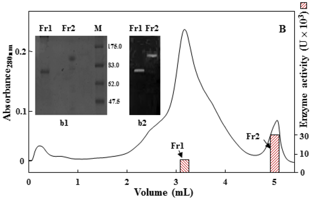 Purification of 75 kDa gelatinase from TYS culture. (A) Diethylaminoethyl (DEAE)-anion-exchange chromatography of extracellular protein from TYS (solid line) and YS (dot line) cultures. The bar indicates the protease activity using hemoglobin as the substrate; and (B) Hydrophobic affinity chromatography of the protease activity fractions eluted from DEAE chromatography. Fr1 and Fr2 protease activity fractions (dashed bars) were analyzed by SDS-PAGE (b1 insert) and gelatin-SDS zymogram (b2 insert).