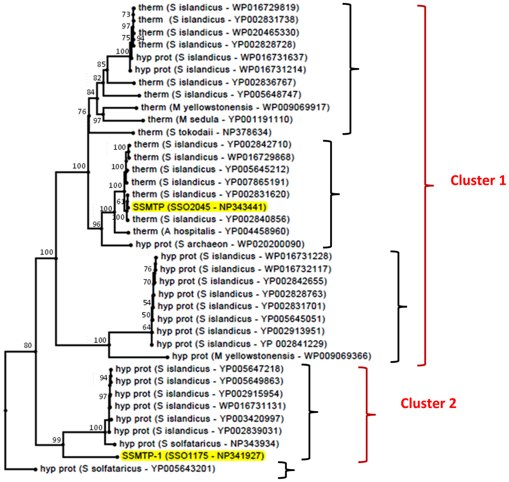 Phylogenetic analysis of SsMTP-1 and SsMTP in the archaeal kingdom (highlighted). The cladogram includes the homologous sequences retrieved from all the archaeal organisms. The numbers at nodes represent the confidence limits computed by the bootstrap procedure (100 replicates). Black curly brackets indicate the five thermopsin-like protein families defined by the phylogenetic tree. Red curly brackets indicate the two clusters, including SsMTP (Cluster 1) or SsMTP-1 (Cluster 2).