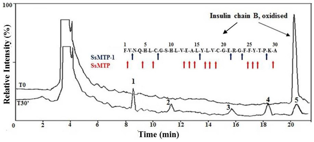 Cleavage site specificity of SsMTP-1. Overlay of the total ion current chromatograms by high-performance liquid chromatography (HPLC)-electrospray mass spectrometry analysis at time 0 (T0) and 30 min (T30) of SsMTP-1 incubated with the oxidized form of the bovine insulin B chain at 70 °C and pH 2.0. The y-axis represents the relative intensity in percentage measured in counts per second (cps) and normalized to the bovine insulin B chain peak height observed at T0. Cleavage site specificity of SsMTP-1, indicated by arrows on the peptide substrate, was shown in the insert. The data relative to SsMTP were taken from Cannio et al. [7].