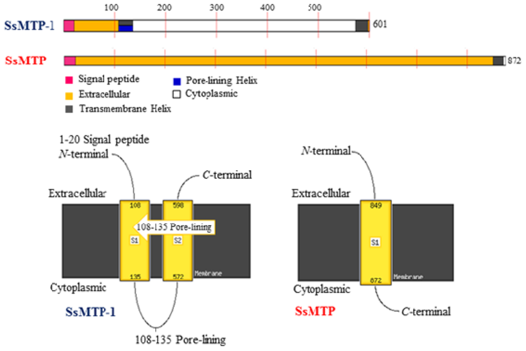 The computational protein function predictions of SsMTP-1 and SsMTP. The schematic diagram of the MEMSAT-SVM (Membrane Helix Prediction) prediction and corresponding transmembrane topology.