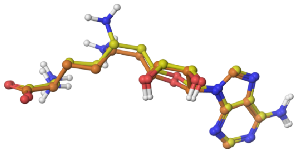 Validation of the docking protocol: comparison of the co-crystal (yellow) vs. predicted (orange) binding mode of sinefungin with Glide XP.