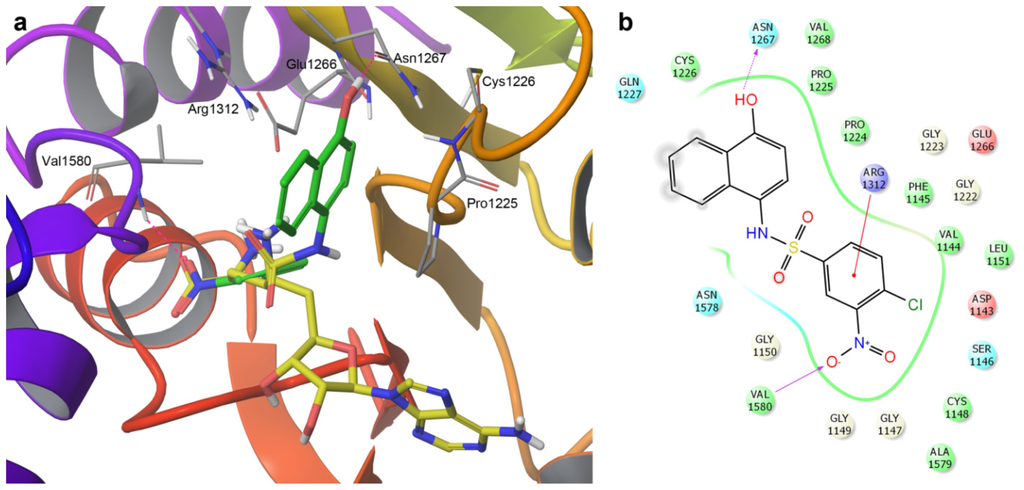 Figure 4 shows three- and two-dimensional representations of the predicted binding mode obtained with IFD for SW155246. The structure of the co-crystal sinefungin that binds in the co-factor binding site is shown in Figure 4a for reference. Figure S1 in the Supporting Information shows a comparison of the predicted binding mode of the active compound SW155246 and their structural analogues SW155246-1 and SW155246-2. A major difference between the predicted binding modes for the three sulfonamides is that the active compound SW155246 occupies part of the co-factor binding site as well as the catalytic site (Figure S1). The hydroxyl group of SW155246 makes a distinct hydrogen bond interaction with the side chain of Asn1267 in the ENV motif of the catalytic site [19]. Of note, Ans1267 is adjacent to the amino acid Glu1266 that participates directly in the mechanism of cytosine C5 methylation by stabilizing the substrate [19]. An additional hydrogen bond interaction was observed between the nitro group of SW155246 and the backbone of Val1580. A π-cation interaction is predicted with Arg1312 in the RXR motif. Arg1312 participate in the mechanism of cytosine-C5 methylation [20]. Interactions between Arg1312 and several other DNMT1 inhibitors, including 5-azacytidine (Figure 1) have been reported [16,20]. In contrast, the two inactive compounds are predicted to occupy only the binding site of the co-factor (Figure S1).