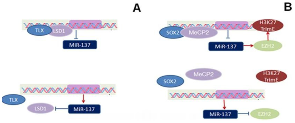 In adult neural stem cells (aNSCs), the regulatory system for miR-137 expression consists of the methyl CpG binding protein 2 (MeCP2), the transcription factor Sox2, and the Histone methyltransferase enhancer of zeste homolog 2 (Ezh2) [11]. MeCP2 is a key member of the methyl CpG binding protein family and is an important transcriptional repressor [14]. MeCP2 interacts with the transcription factor Sox2 to form a complex that binds to the promoter region of miR-137 and establishes an epigenetic state in the chromatin to inhibit miR-137 transcription. In addition, the miR-137-mediated repression of Ezh2 can feedback to chromatin in the form of a global decrease in histone H3 trimiethyl lysine (H3-K27-Tri-Me). Coexpression of Ezh2 can rescue phenotypes associated with miR-137 overexpression, suggesting another regulatory loop in epigenetic regulation of miR-137 [11,15] (Figure 1B). Therefore, the crosstalk between miR-137 and epigenetic regulation may coordinately regulate aNSCs fate.