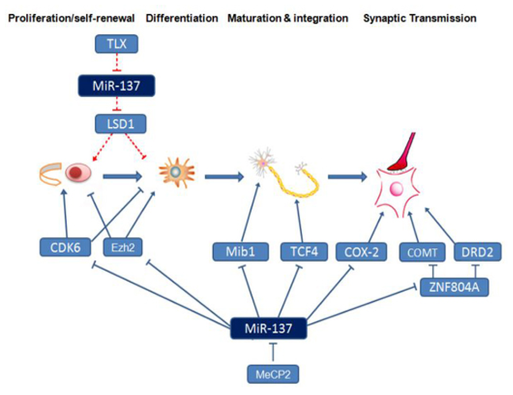 MiR-137 is a miRNA that is highly expressed in the brain [9]. It can regulate both neurogenesis and synaptic plasticity, and recently it has been confirmed as an important susceptibility-related gene for schizophrenia. The purpose of this paper was to summarize the regulatory function of miR-137 in neurodevelopment and schizophrenia as well as to improve our understanding of the molecular mechanisms underlying schizophrenia.
