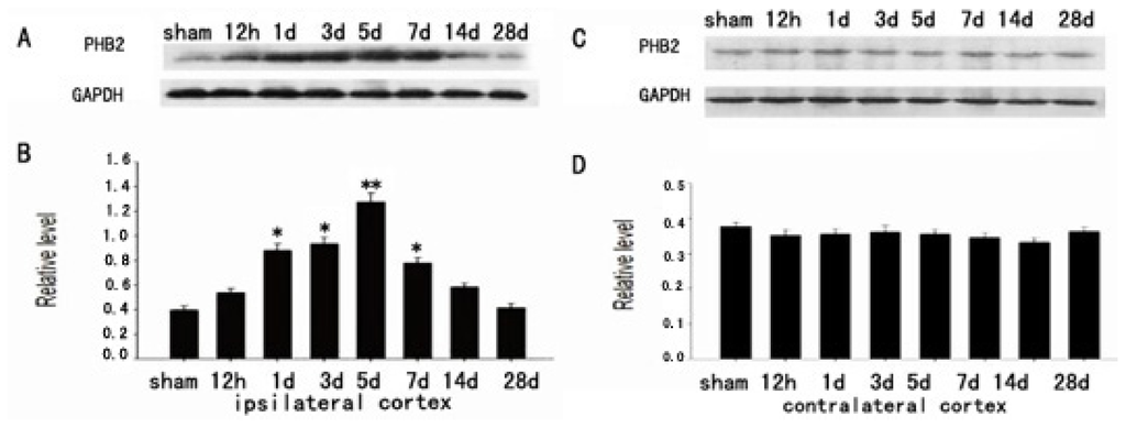 The expression of PHB2 in brain cortex by Western Blot during TBI. Western Blot was performed to confirm the temporal patterns of PHB2 expression during traumatic brain injury (TBI). In the cortex surrounding the wound, The PHB2 protein levels were relatively lower in the sham-operated brain cortex, then increased from 12 h after TBI, peaked at day five, and then gradually decreased to the normal level (A) while protein level had no alterations in the control group (C); Quantification graphs (relative optical density) of the intensity of staining of PHB2 to GAPDH at each time point (B,D). GAPDH was used to confirm equal amount of protein was run on gel. The data are means ± SEM, * p < 0.05, ** p < 0.01 (n = 5).