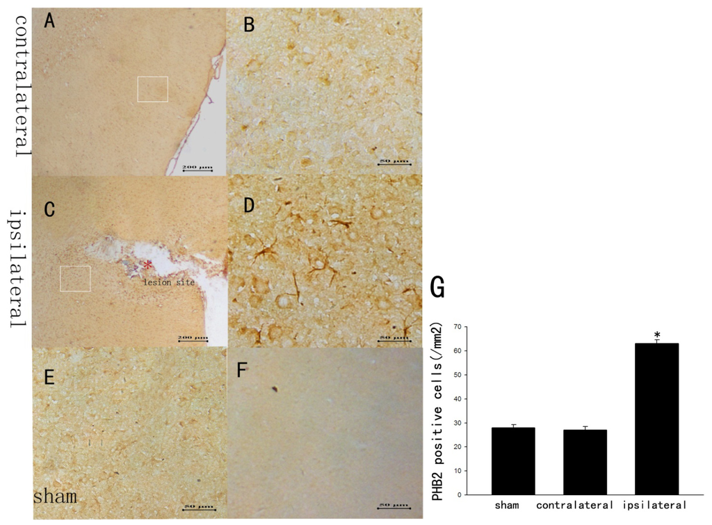 We could see that the immunostaining of PHB2 staining was widely distributed throughout the rat brain in the contralateral and sham brain but with a relatively lower level staining, and the major cellular morphology of PHB2-positive cells appeared as neuron (Figure 2A,B,E), while the expression pattern was different that expression was intensive and the cellular morphology appeared as both neurons and astrocytes at day 5 after TBI (Figure 2C,D). Quantitative analysis documented that there was a dramatic elevation of PHB2 positive cells after TBI (Figure 2G).