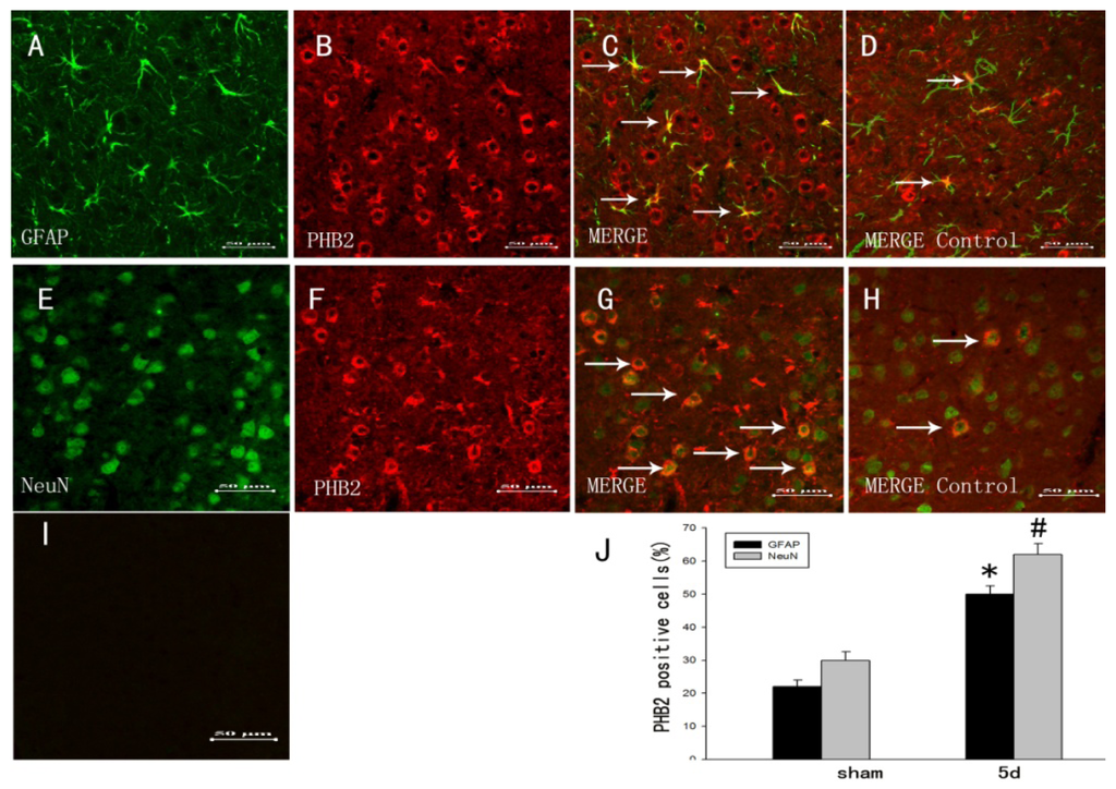 The colocalization of PHB2 with different cellular markers by double immunofluorescent staining. In the adult rat brain cortex within 1 mm distance from the lesion site at the fifth day after TBI, horizontal sections labeled with cell-specific markers: NeuN (a marker of neurons), and GFAP (a marker of astrocytes). We found that PHB2 was positive with astrocytes (A–C); Meanwhile, the positive PHB2 in neurons were also demonstrated by co-staining with anti-NeuN (E–G); To identify the proportion of each phenotype-specific marker-positive cells expressing PHB2, cell counting was performed in control and TBI five-day group. PHB2 expression was significantly higher in neurons and astrocytes (C,G) at five days compared with sham brain (Figure 3D,H); (I) Negative control. Quantitative analysis of NeuN and GFAP-positive cells expressing PHB2 (%) in the sham-operated group and day five after injury (J). Error bars represent SEM, Scale bars: 50 μm (A–I), * p < 0.05, # p < 0.05 (n = 3). The white arrows represent the co-expression of protein.