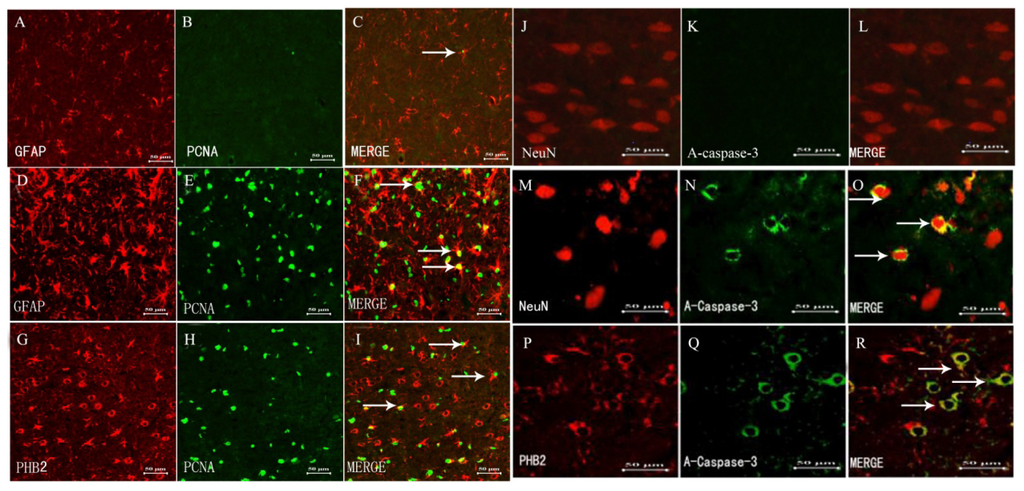 To explore the potential role of PHB2 in survival and proliferation after TBI. Double immunofluorescence staining was used for PCNA, GFAP, activated caspase-3 and PHB2 in brain cortex after TBI. In the adult rat brain at five days after injury or the sham group, sections labeled with PCNA (Figure 4B,E) and GFAP (Figure 4A,D), and the co-localization of PCNA with GFAP were identified in brain (Figure 4C,F). The majority of reactive astrocytes were PCNA-positive at five days after TBI (Figure 4F) and the PCNA-positive astrocytes were increased in the experiment group compared to the sham group (Figure 4C). In the rat brain after TBI, PHB2-positive cells were also co-localized with PCNA (Figure 4G–I). Sections labeled with activated caspase-3 (Figure 4K,N) and NeuN (Figure 4J,M), and the co-localization of activated caspase-3 with NeuN was also shown in the brain after TBI. Moreover, there was also a coincidence of PHB2 (Figure 4P–R) with activated caspase-3 at five days after TBI by adjacent serial sections.