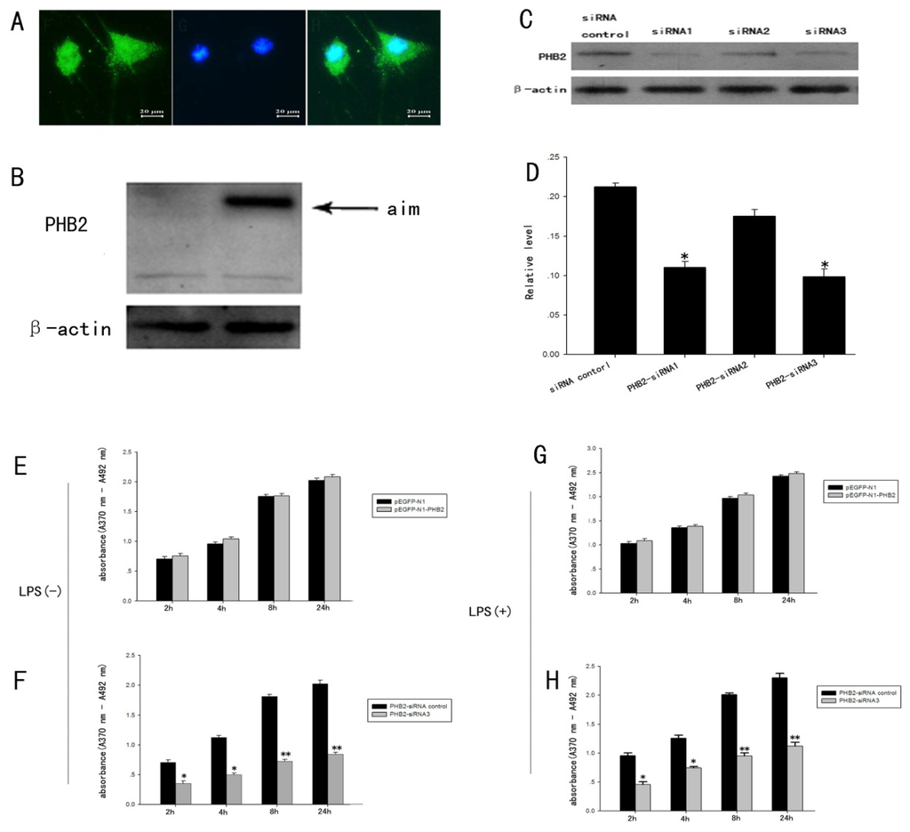 The influence of proliferation of primary cultured astrocytes induced by LPS confirmed by BrdU ELISA detection technology. Immunofluorescence showed that PHB2 localized in both cytoplasm and nucleus of primary cultured astrocytes (A); Western Blot results showed that, there was a band at the anticipated size (the size of fusion protein) position on the cellulose acetate membrane after transfection with pEGFP-N1-PHB2 (B); but not transfection with pEGFP-N1. As shown by Western Blot analysis, siRNA3 made a significant effect in reducing PHB2 expression (C,D); BrdU ELISA results show that proliferation of astrocytes, induced by LPS (G,H); was higher than that in the control group (E,F); (E,G) showed that the proliferation of astrocytes which over-expressed PHB2 was slightly higher than that in the control group, but there was no significant difference; (F,H) Cell proliferation was inhibited after the PHB2 was interfered with in astrocytes, resulted in a significant difference from the control group. Error bars represent SEM, Scale bars: 20 μm (A), * p < 0.05, ** p < 0.01 (n = 3).