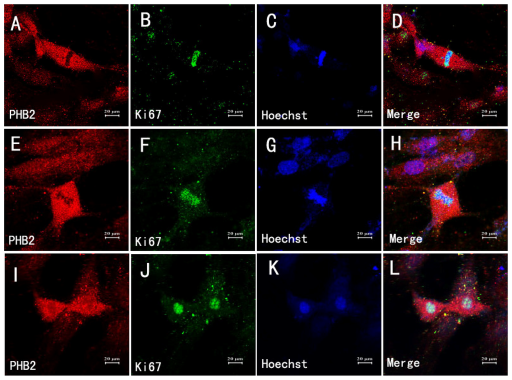 The relationship between astrocytes mitosis and PHB2. Fluorescent double labeling demonstrates: Cells at late metaphase showed high expression level state of PHB2 (A,E,I); PHB2 and Ki67 (marker of cell proliferation) (B,F,J) double-fluorescent staining results further prove these types of cells were in late metaphase (D,H,L). Hoechest in C,G,K is the marker of nuclear. Scale bars: 20 μm (A–L).